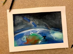 - Otroci imajo pripravljene palete z akvarelnimi barvami, svinčnik, redirko in risalni papir.